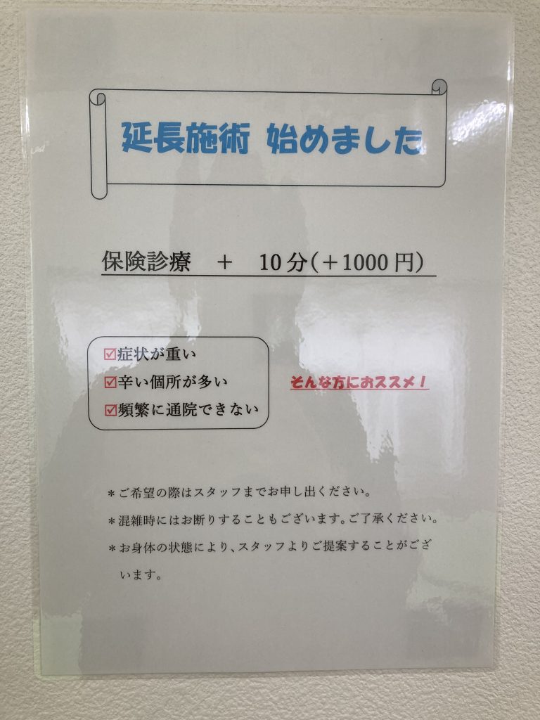 いつもご利用ありがとうございます。症状が辛い方、頻繁に通院できない方のため延長施術を始めました!